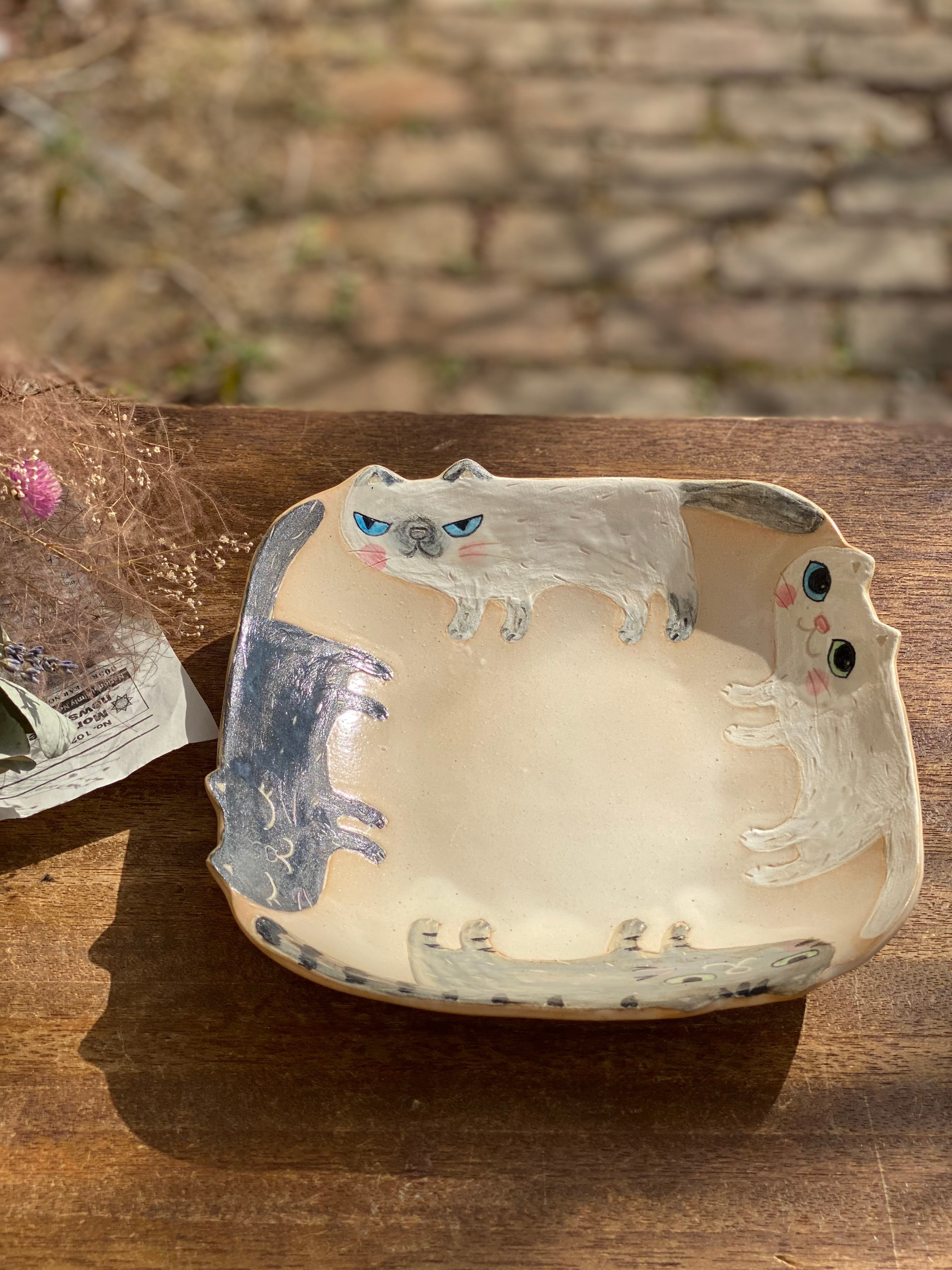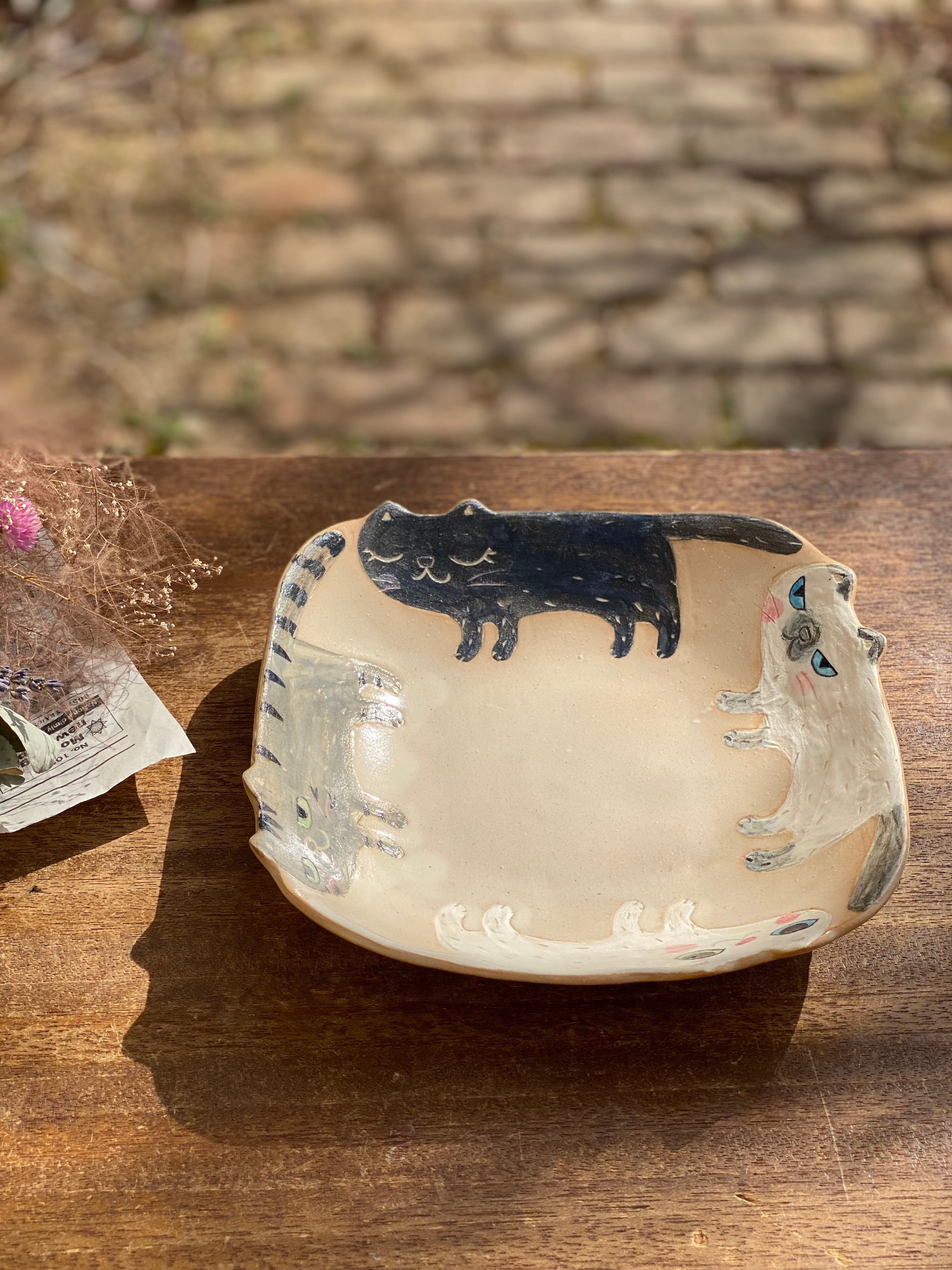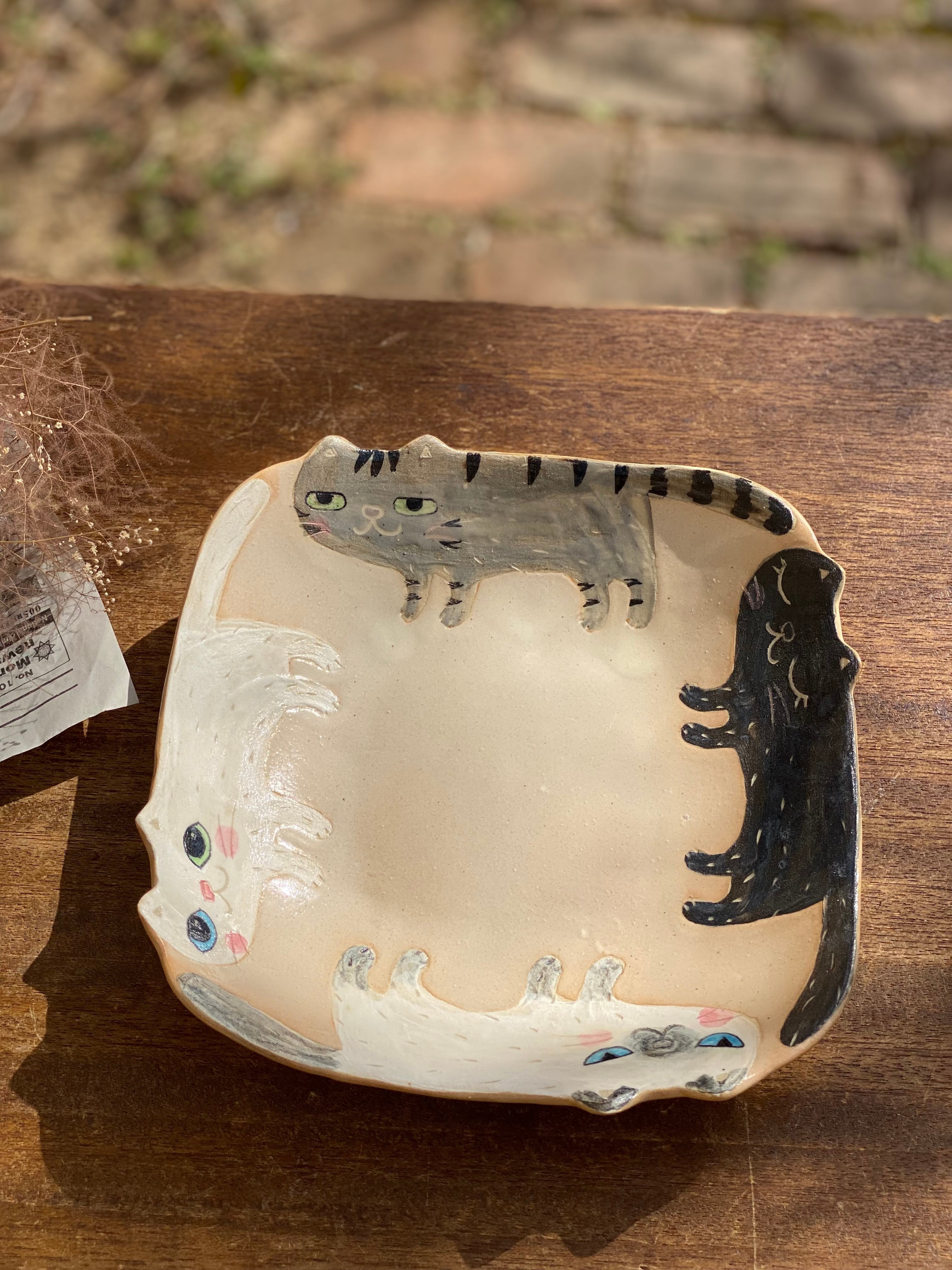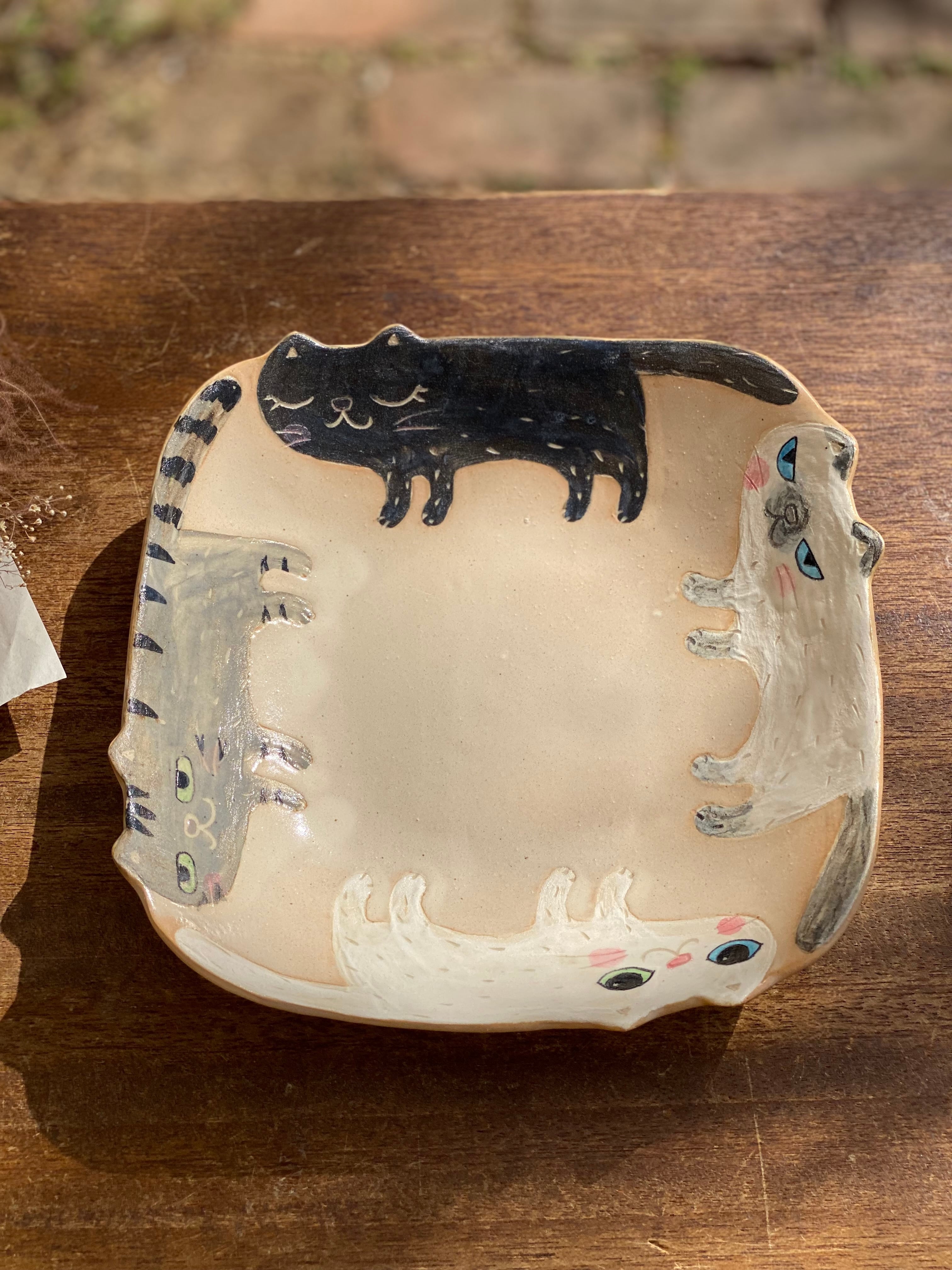 作品名 4匹のねこ四角大皿
