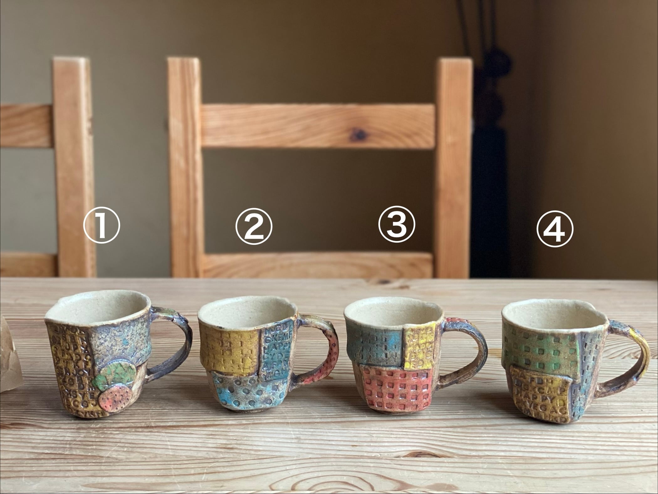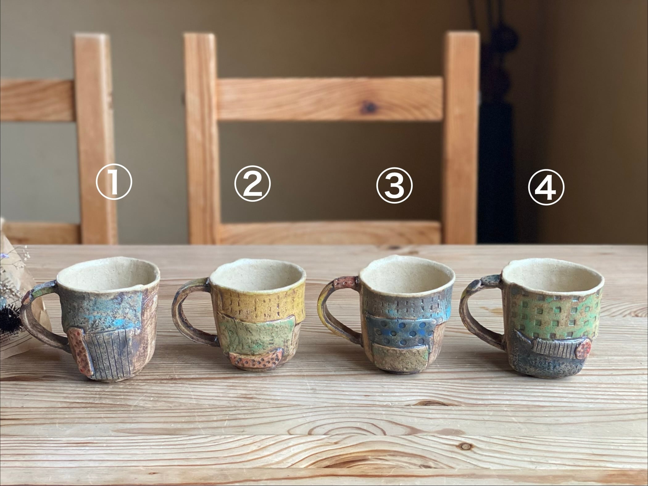 粘土をパッチワークのように張り合わせたデザインのマグカップです。